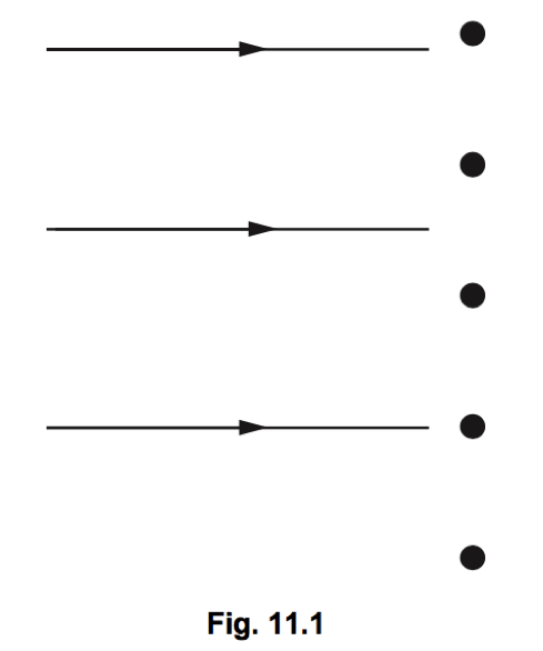Q11. In Geiger and Marsden’s α-particle scattering experiment, α-particles were directed at a very thin gold foil. Fig. 11 shows five of the nuclei of the atoms in one layer in the gold foil. Also shown are the paths of three α-particles directed at the foil.